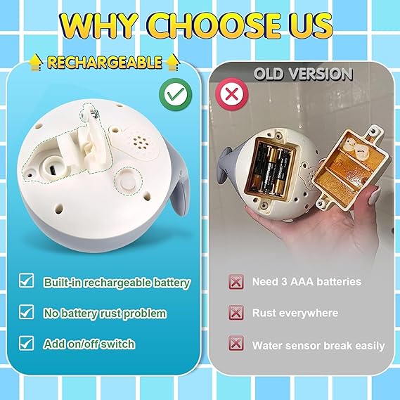 - Rechargeable Whale Bath Toy: Equipped with a rechargeable battery, saves you from having to replace with new batteries all the time. Our cute whale baby bath toys can automatically spray water and flash colorful lights when you put bath toys for toddlers in the water. This Bath toys 6 months bring endless entertainment for baby baths, fun baby toys to entice your child into taking baths, and your baby will enjoy every bath time